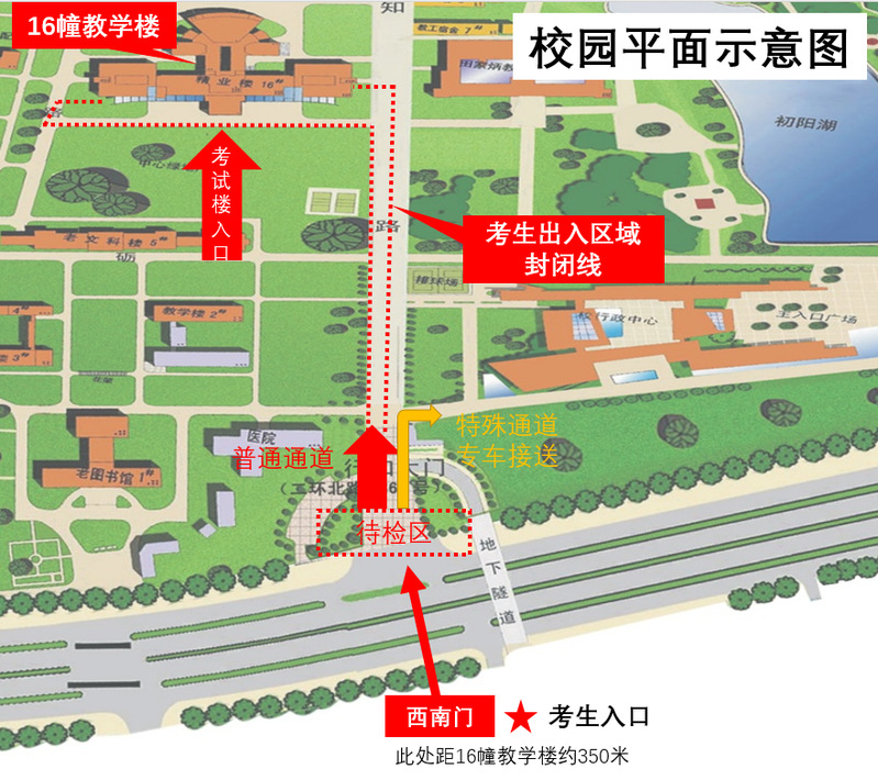 入校大门:所有考生一律从西南门进校,私家车在校门口即停即走。进校后严格按照学校规定路线步行至16幢教学楼参加考试,考试结束后按照规定路线离校,不得在校园内滞留,不得进入封闭线和考场之外的校内其他区域。