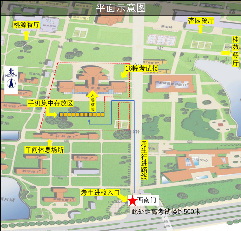 入校方式:学校西南门设有考生专用通道,考生可凭准考证和有效居民身份证从专用通道步行入校。学校东南门距离考试楼较远,请考生注意不要走错。其他人员不得进入考试楼封闭区域。